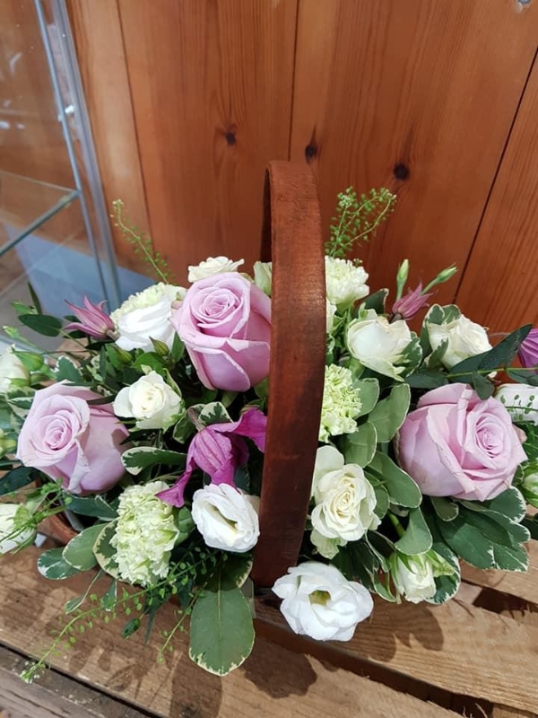 Beautiful under the handle design, ideal for any occasion, the recipient doesn't have to do anything apart from enjoy. The type of basket used may vary depending on what we have in stock at the time of ordering and the colour will be florist choice to go with the occasion