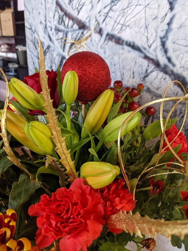 Floral boxes are one of our best sellers. They are ready for the recipient to place where they can be enjoyed without the need to find a vase, flowers also last longer in them because light doesn't get to the stems which causes bacteria build up.  The flowers will be in Christmas colours..