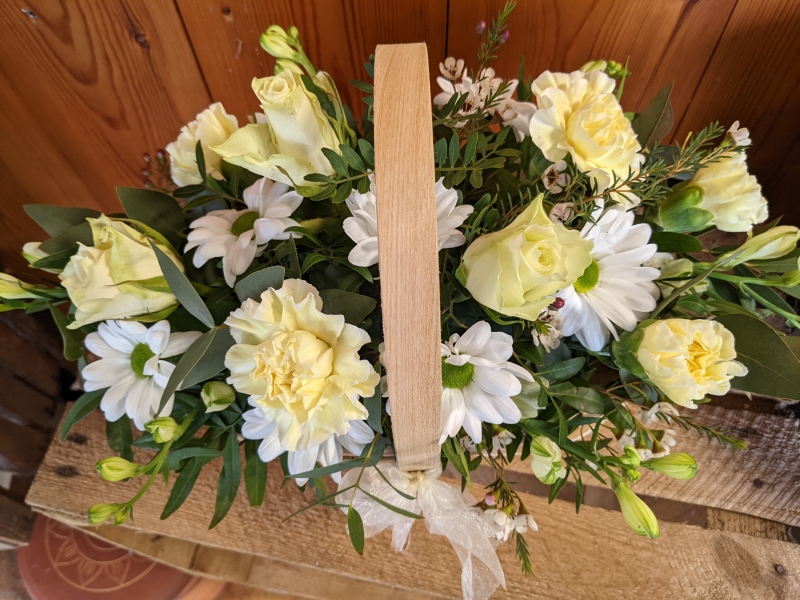 This is a lovely basket containing a traditional mix of flowers  NB The basket, colour and variety of flowers may vary. Basket arrangement for birthday, anniversary.  Thank you. Get well .flower delivery