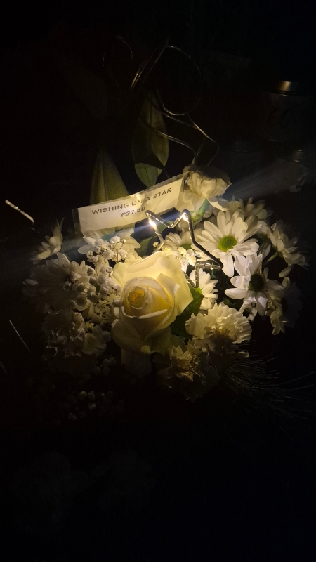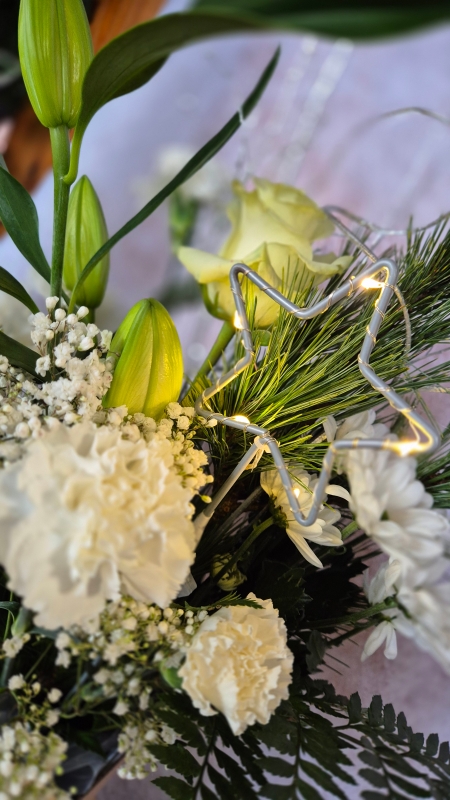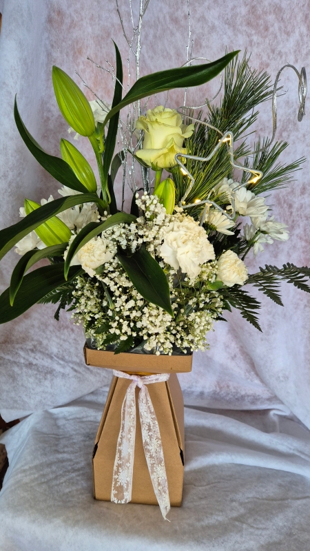 A gorgeous floral box includes a battery operated star 🌟 No need for a vase, recipient can enjoy them straight away already arranged for them to enjoy. Flowers last longer in these as light doesn't get to the water causing bacteria build up.