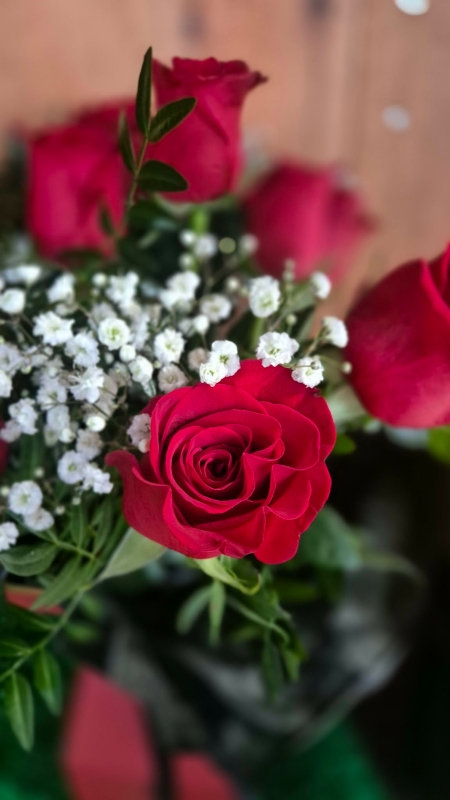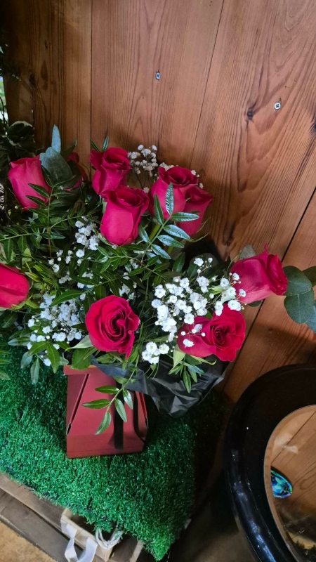 !2 Roses presented in a floral box, includes foliage, Gyp ( the fluffy white stuff) Thalpsi, Statice or Hypericum. Florist Choice.